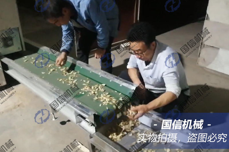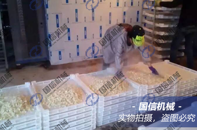 熱風(fēng)干燥:把瀝干表面水分的鱗片放入料斗內(nèi),經(jīng)自動(dòng)鋪料裝置送入百合烘干機(jī)*上層進(jìn)行干燥,溫度控制在60-70℃,在網(wǎng)帶的帶動(dòng)下,百合鱗片從上層往下層移動(dòng)。運(yùn)行中,百合片受到翻料器的翻動(dòng),同時(shí),百合鱗片有多次往下落的過程,使百合鱗片翻動(dòng)更徹底。*后,干燥至百合鱗片含水量至10%左右(手摸鱗片發(fā)脆為度),干燥好的百合干片從百合烘干機(jī)底層的出料口排出。