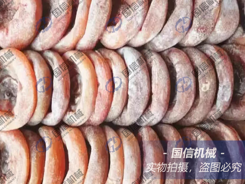烘干一道工序:柿果進(jìn)入烘室后,迅速提升溫度至40℃~50℃,使柿果中的乙醇脫氯酶活性處于高狀態(tài),以使柿果內(nèi)呼吸速度提高,快速完成軟化、去澀和部分脫水(約25%),持續(xù)烘干時(shí)間視柿果大小和成熟程度而定,約12小時(shí)左右。烘干柿子時(shí),防霉很重要。稍有不慎,就會(huì)導(dǎo)致整個(gè)烤房的柿子在幾個(gè)小時(shí)內(nèi)發(fā)霉腐爛。因此,烘烤中的相對(duì)濕度要保持在70%以下,這樣可以有效地預(yù)防發(fā)霉。