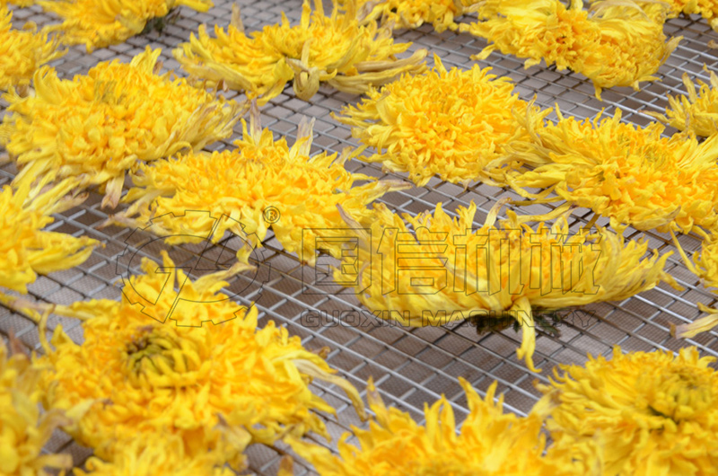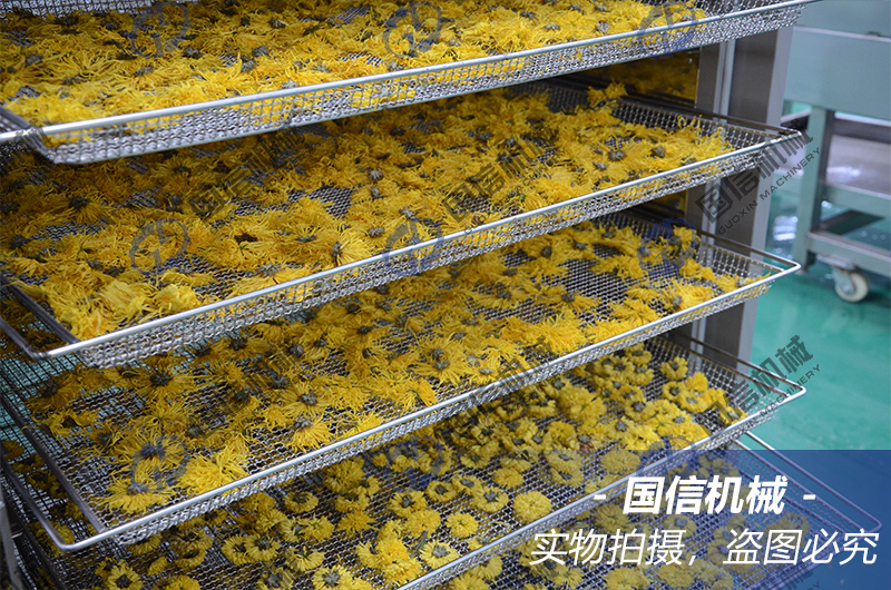 (部分菊花需要?dú)⑶嚯A段:設(shè)置溫度65℃~70℃,時(shí)長(zhǎng)2~3小時(shí),如果需要,可以在進(jìn)料前在鮮菊花上噴灑少量清水,殺青效果更好。)