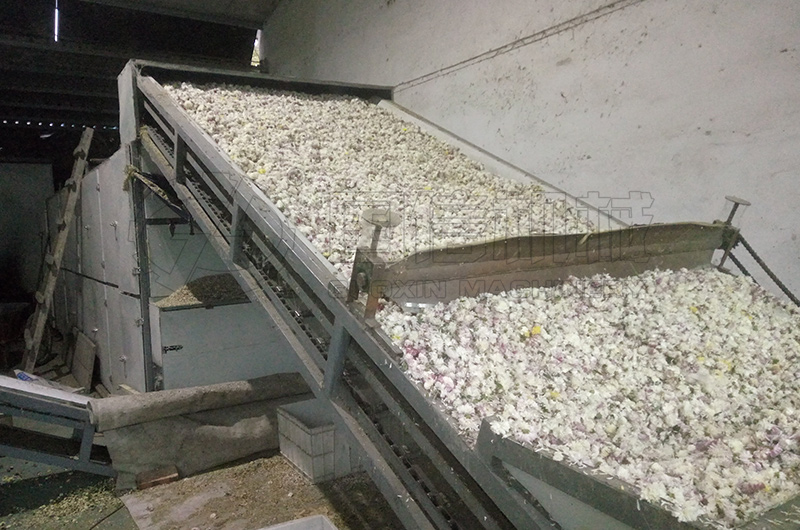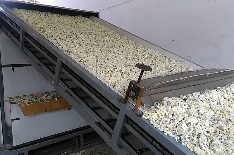 新鮮菊花的烘干我們用無硫烘干法,設備采用網(wǎng)帶式穿流干燥機進行烘干,通過自下而上穿過網(wǎng)帶及物料層的熱氣流使菊花花朵溫度升高,均勻干燥。