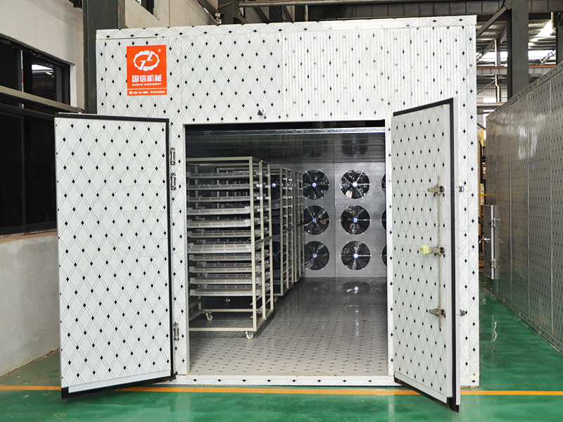 國信空氣能熱泵烘干房由物料托盤、空氣管道、熱泵烘干除濕機(jī)、多套耐高溫軸流風(fēng)機(jī)、帶輪子的手推車支架、10cm具有高保溫性能的聚氨酯板組成。