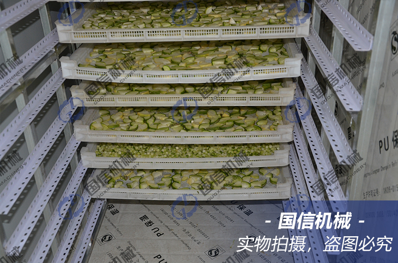首先將溫度設置到43-48℃,濕度保持53℃,時間1-2小時,它使蔬菜表面的水分吸收能量變?yōu)樗魵夂蟠罅克舭l(fā)出去。當熱氣流速越快,溫度越低,而烘干房相對濕度越小,同時含水率下降,干燥速度加快。