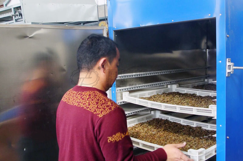 接下來把洗凈的蝎子裝盤,放到烘干箱進(jìn)行干燥,據(jù)技術(shù)介紹:在蝎子的加工過程中,動(dòng)作一定要輕拿輕放,盡可能保持蝎子的完好,避免因斷頭、尾、足,降低了蝎子的藥效。